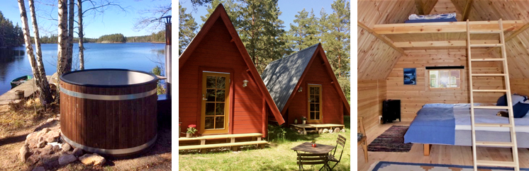 En stor del av upplevelsen av skogsbadet skapar man själv. Carina tillhandahåller möjligheterna genom de faciliteter som finns - bastu, badtunna och grillstuga. Och boende. Tanken var att bygga två gäststugor för övernattning på tomten där Carina och hennes man Kenneth bor. Det är ett gammalt soldattorp från 1800-talet. Att bygga två "vanliga friggebodar" med platta tak kändes inte rätt. Deras dotter som jobbar som landskapsarkitekt föreslog en stuga i A-framestil, då Carina såg framför sig att det skulle kunna få likna ett tält. Så blev det och nu står två faluröda Tjakke på en trygg och naturlig plats, någonstans utanför vardagshetsen. I skogen. Där de en gång kom ifrån.